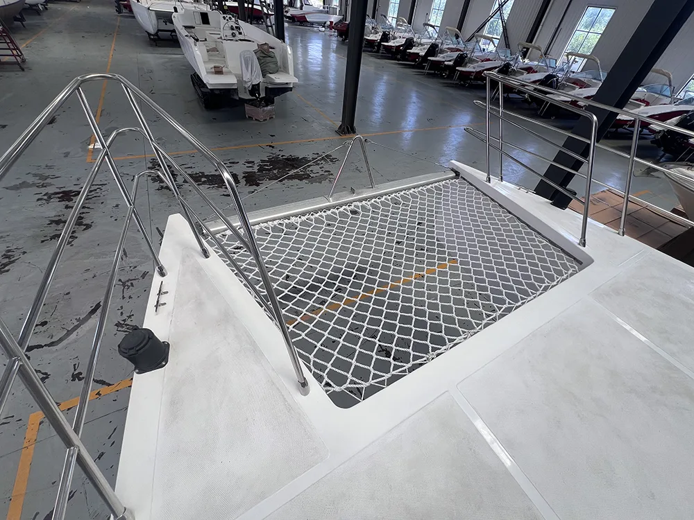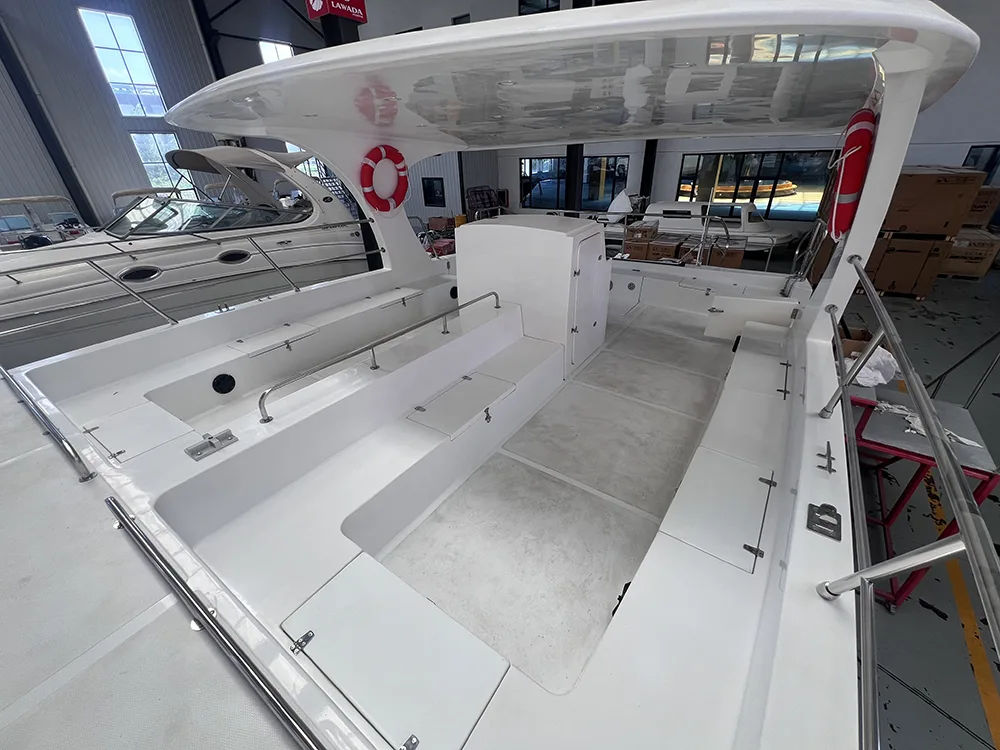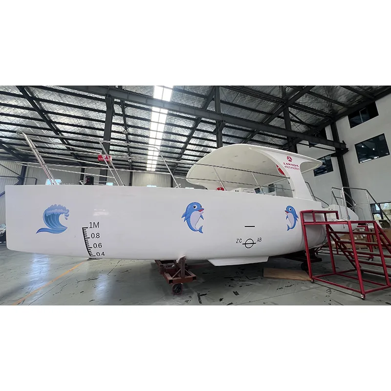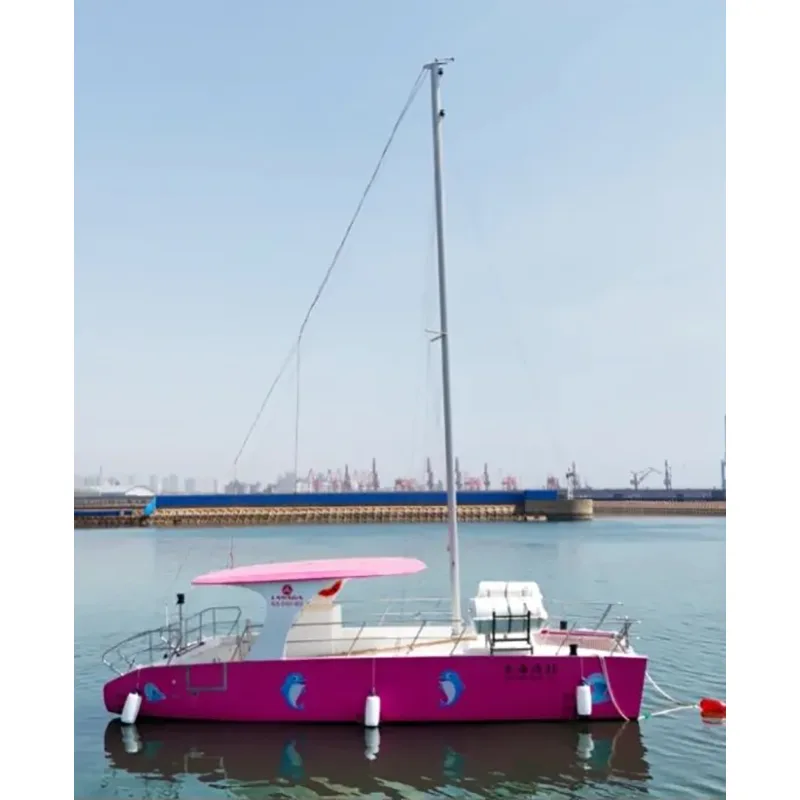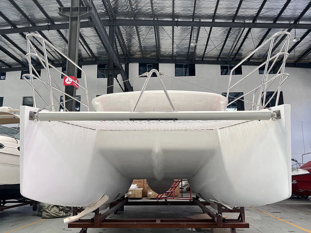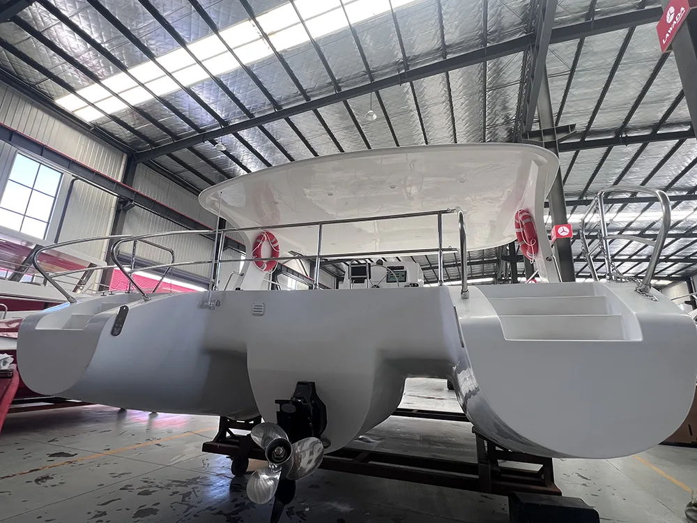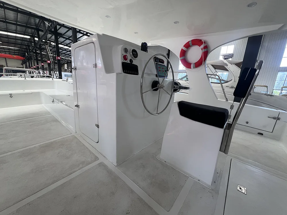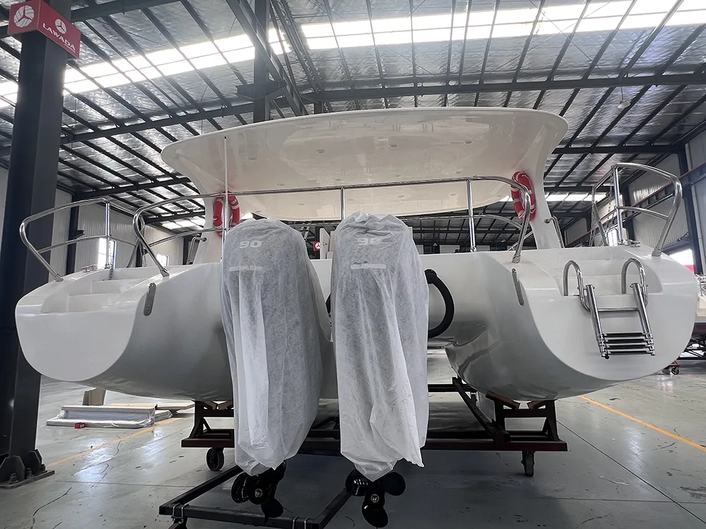 ህግ ዳው®30ft የንግድ ካታርራን በወጪ ሞተር, ድርብ ማውጫ ሞተር ወይም በፎቶግራፍዎ ውስጥ እንኳን ሳይቀር የተያዙት ሞተር ሊኖረው ይችላል